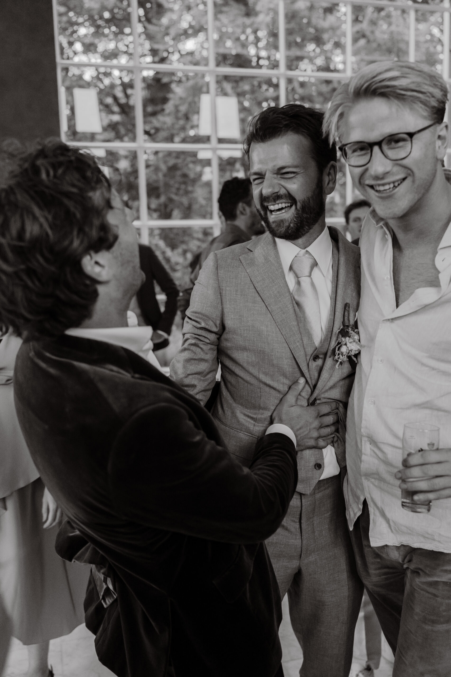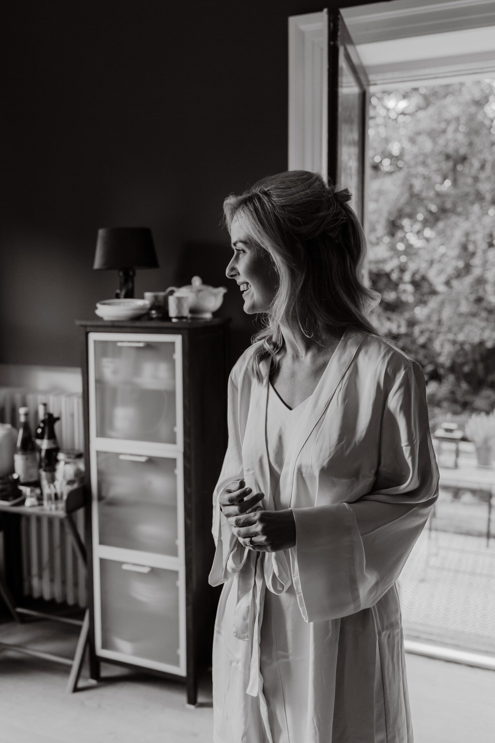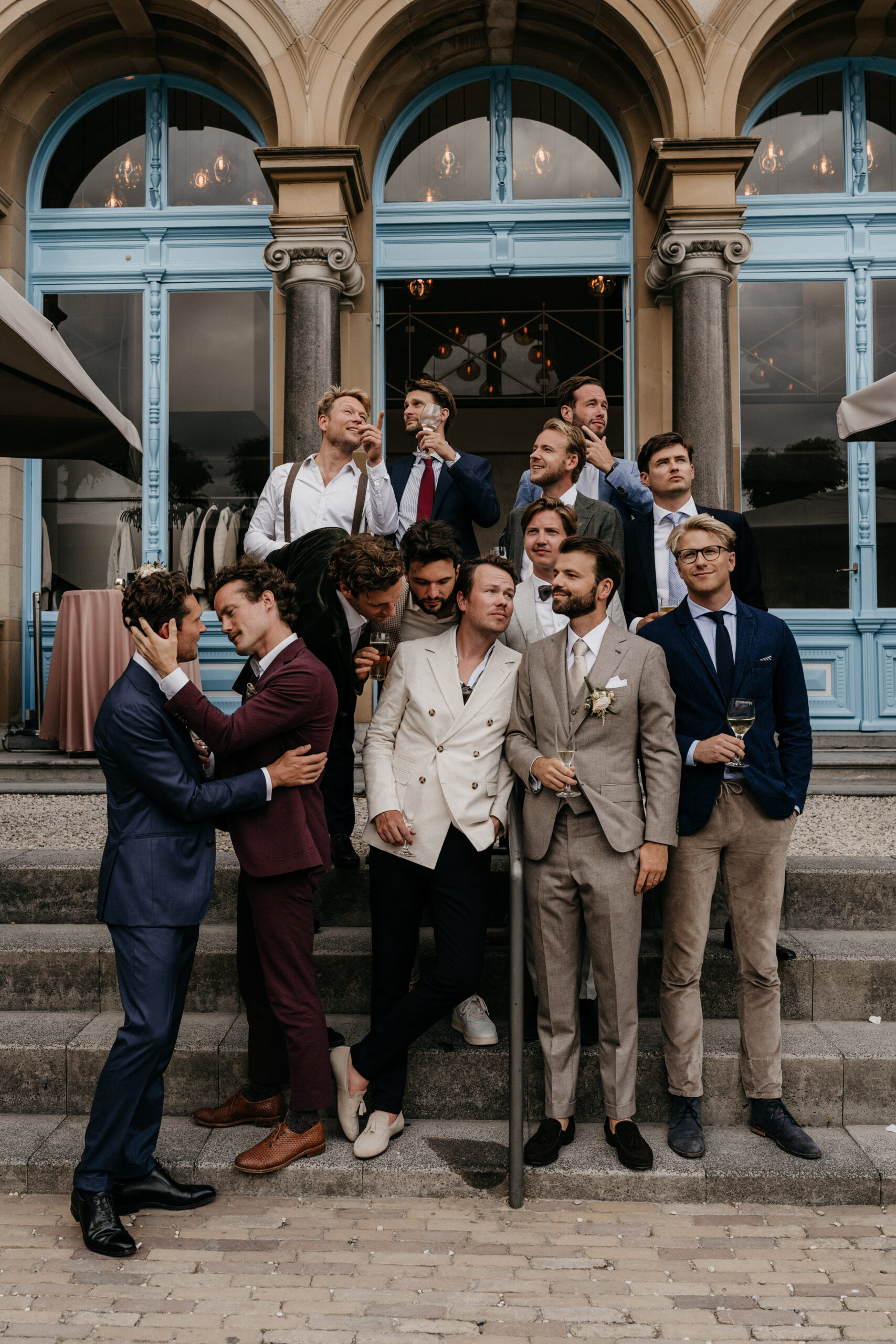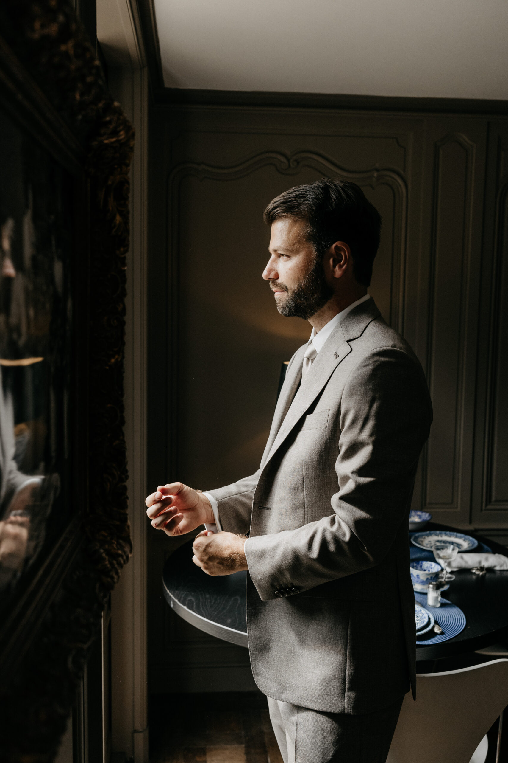 De dag begon bij B&B Elswoutshoek in Overveen, een fijne en rustige plek om de bruiloft te starten. Hier waren twee aparte kamers waar het bruidspaar zich, omringd door vrienden en familie, ging klaarmaken. Een ontspannen sfeer, veel gelach, er werd geproost en mooie kleine momentjes, precies zoals je hoopt dat een trouwdag begint.
