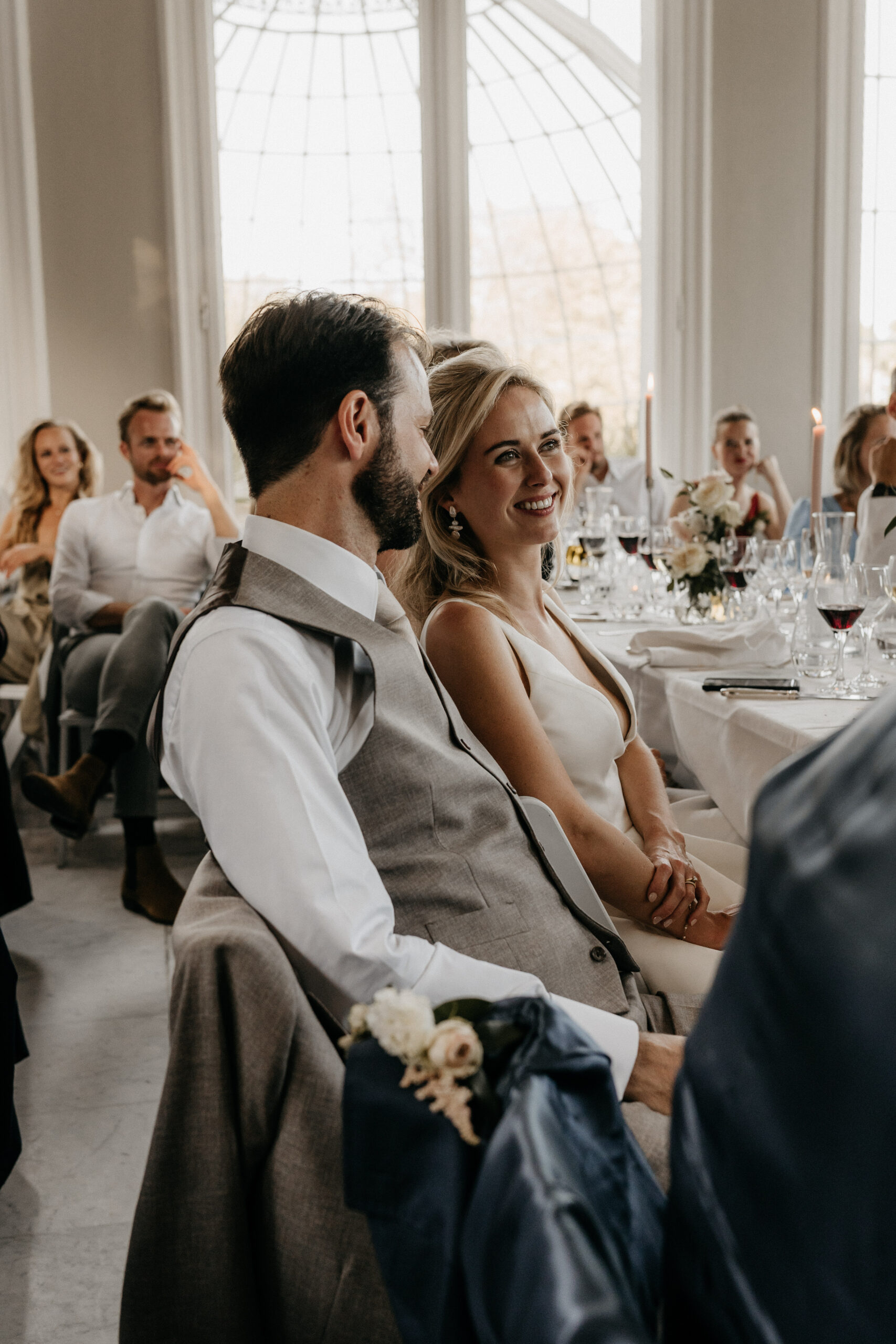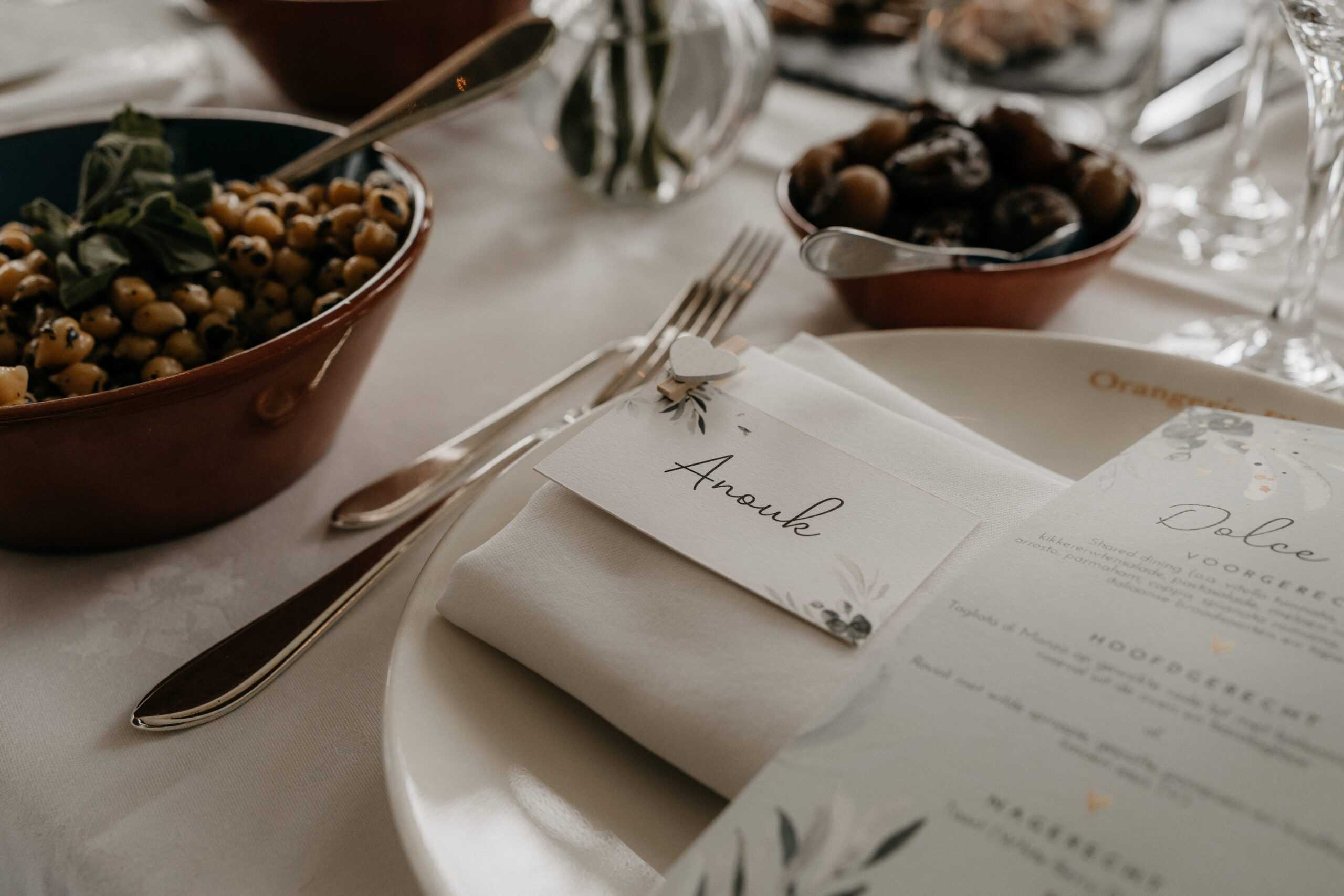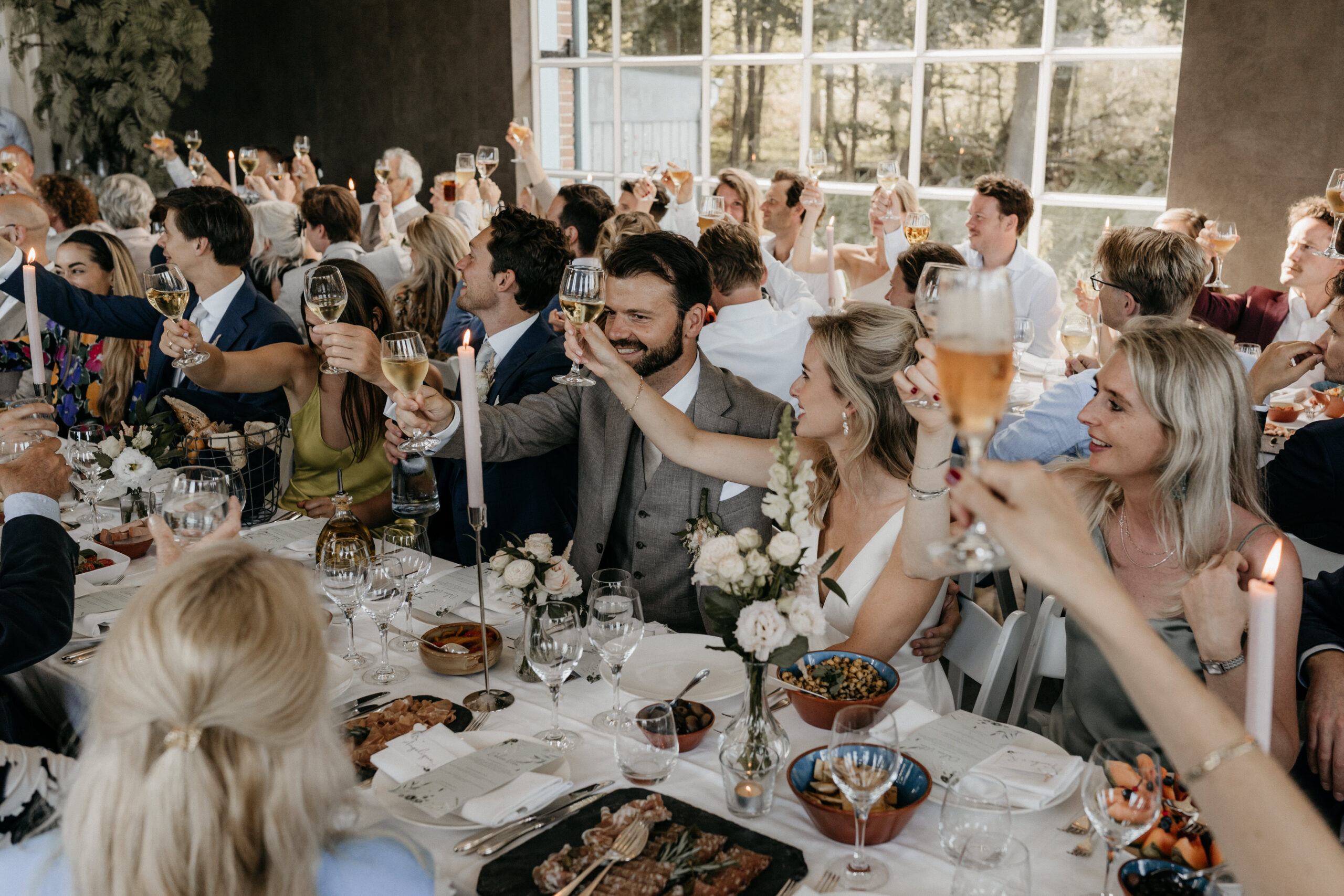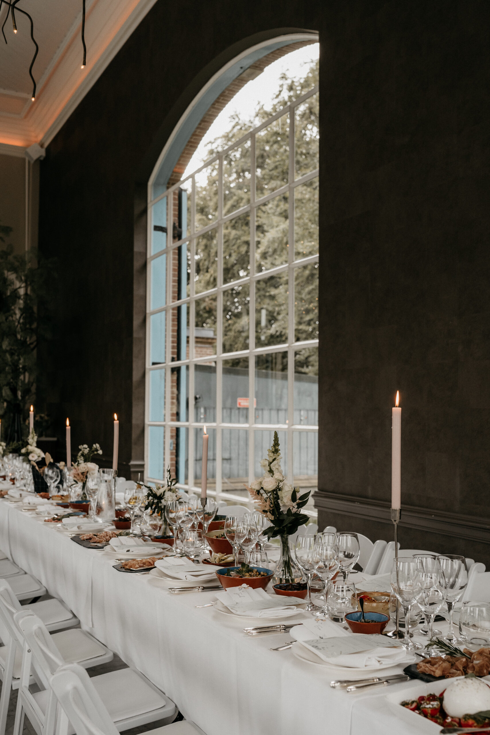 Na de ceremonie werd er geproost met oesters. Geen taart op dit moment, want die werd bewaard tot na het diner, als toetje. Eerst was er tijd om te borrelen en bij te praten, waarna iedereen aanschoof voor het diner aan lange, prachtig gedekte tafels. Ook binnen is Orangerie Elswout adembenemend mooi.