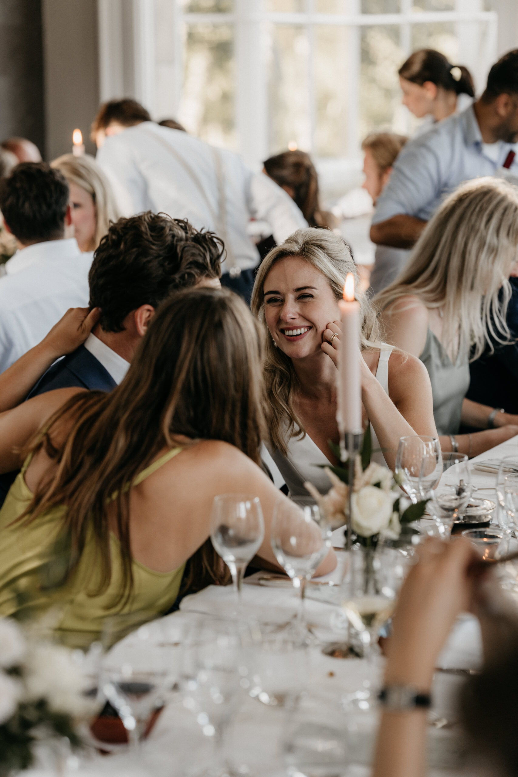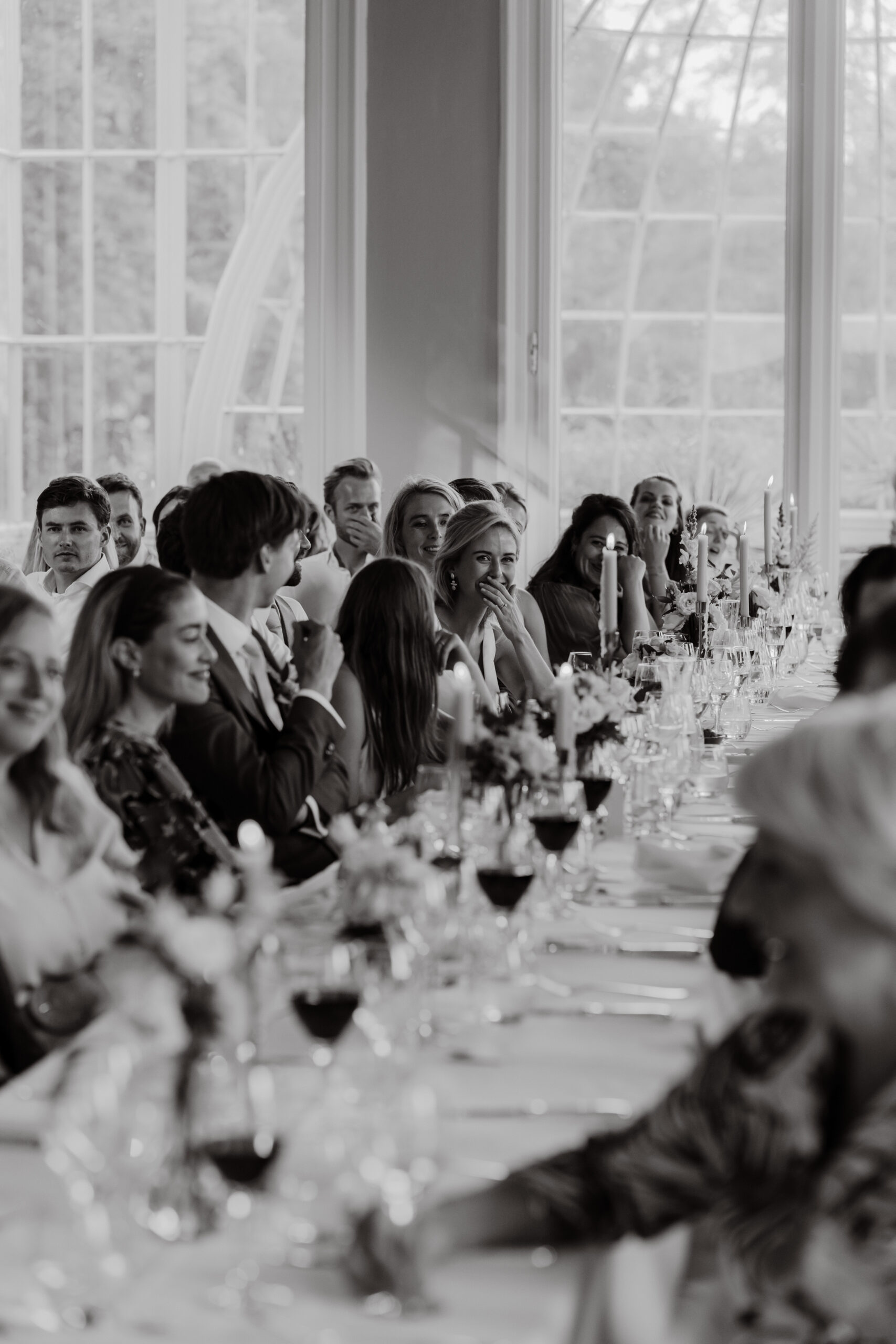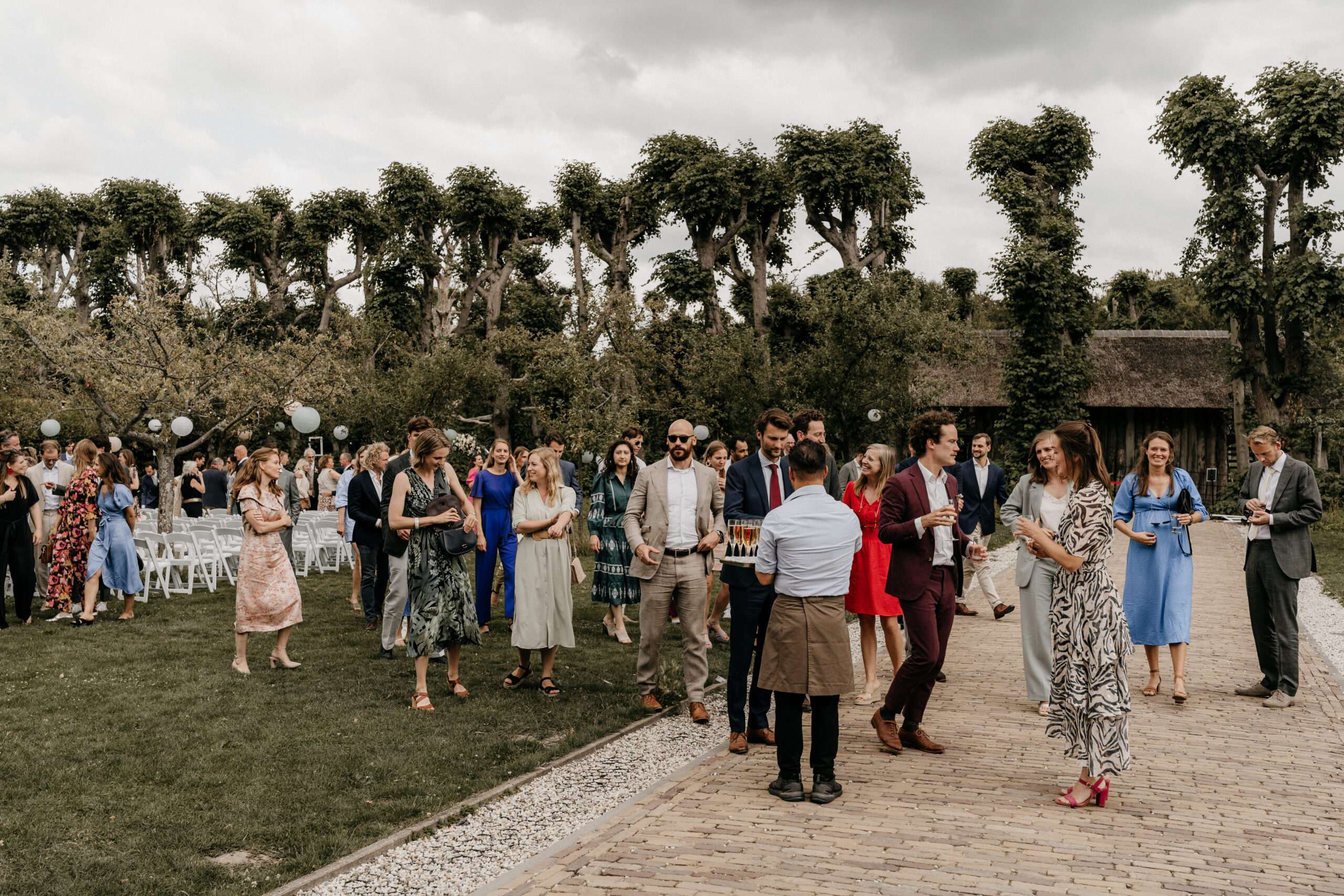 Na de ceremonie werd er geproost met oesters. Geen taart op dit moment, want die werd bewaard tot na het diner, als toetje. Eerst was er tijd om te borrelen en bij te praten, waarna iedereen aanschoof voor het diner aan lange, prachtig gedekte tafels. Ook binnen is Orangerie Elswout adembenemend mooi.