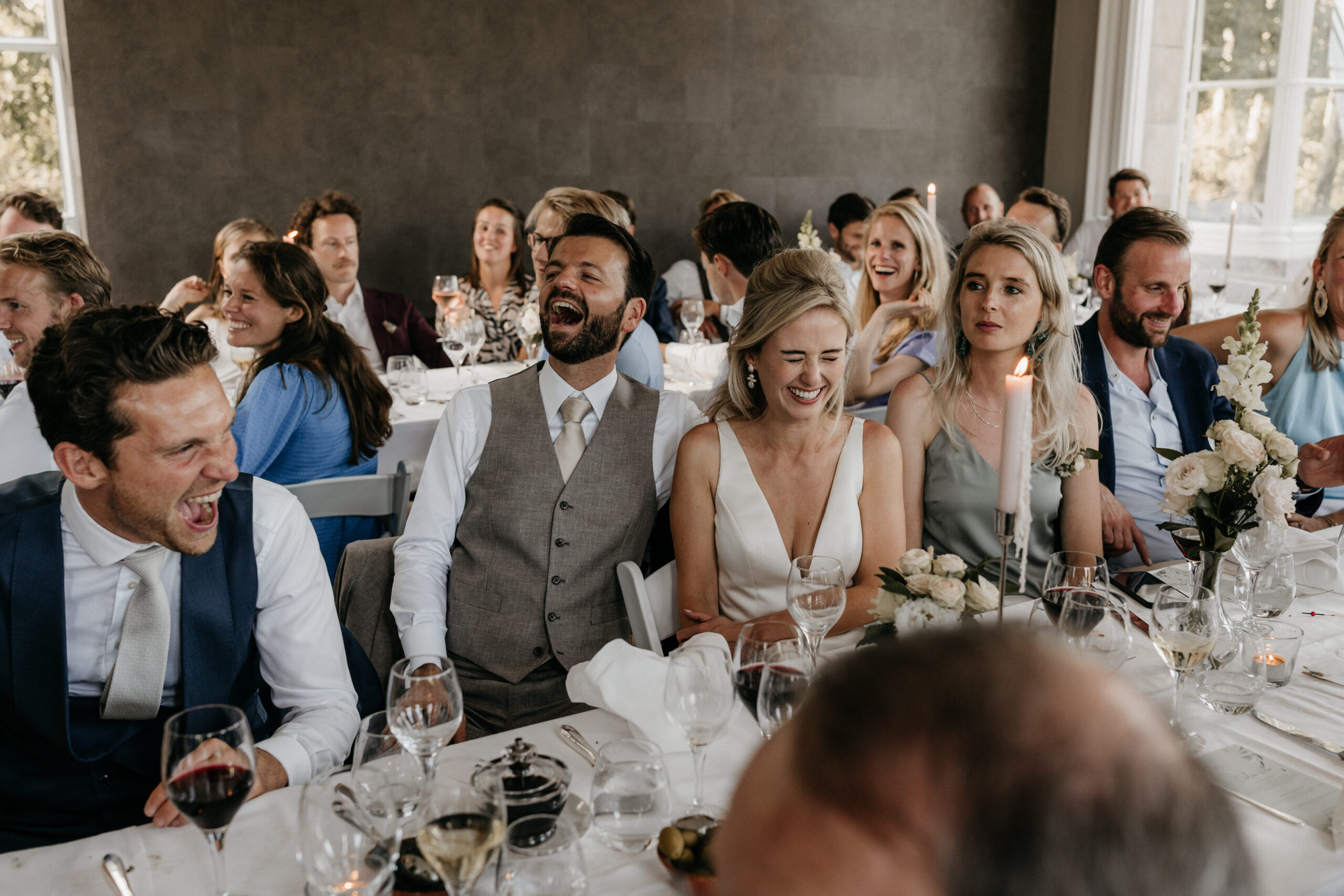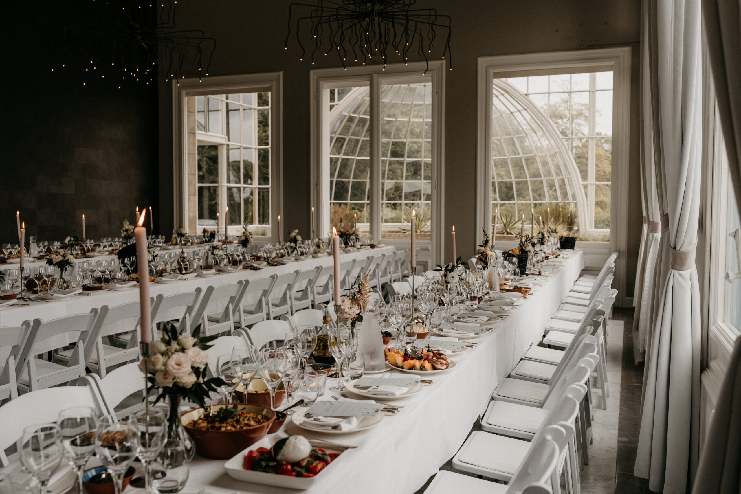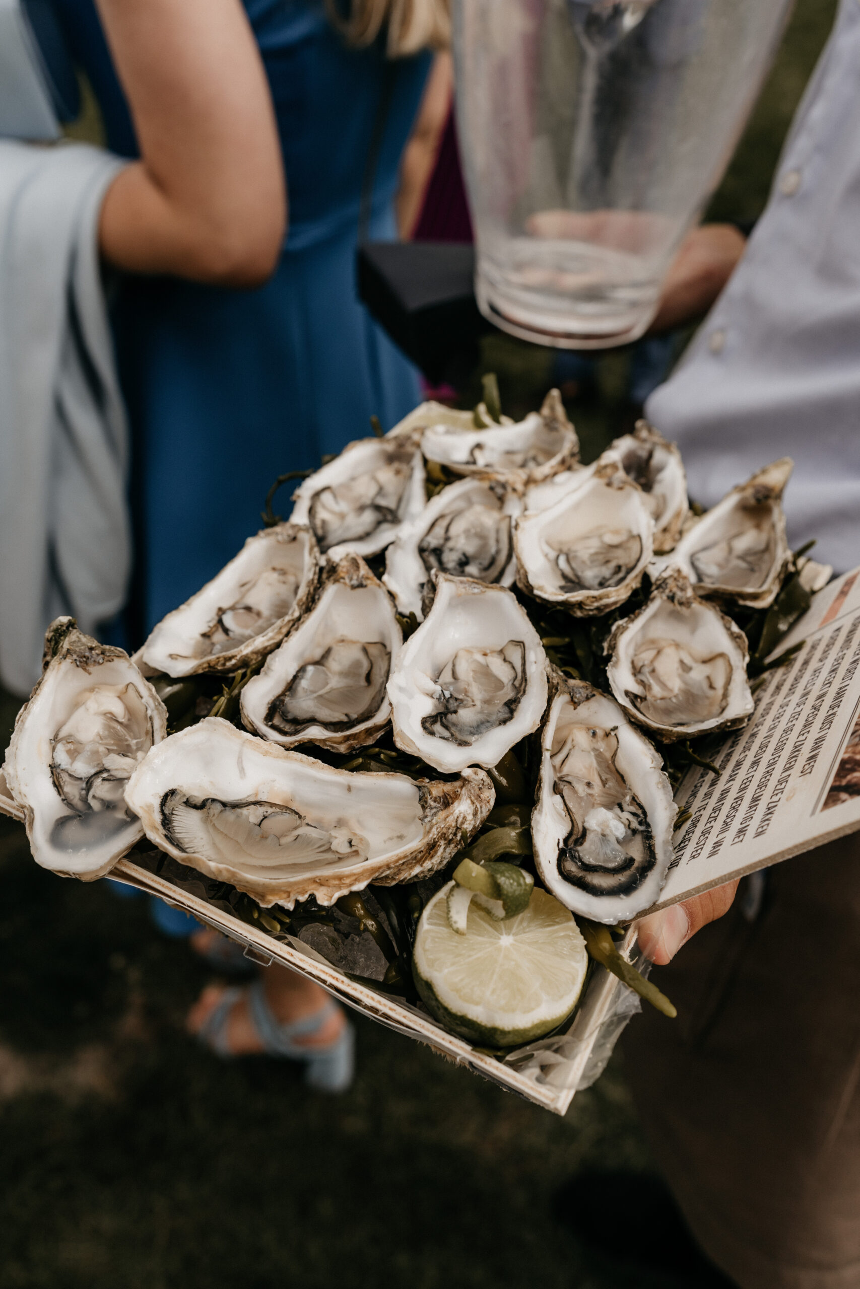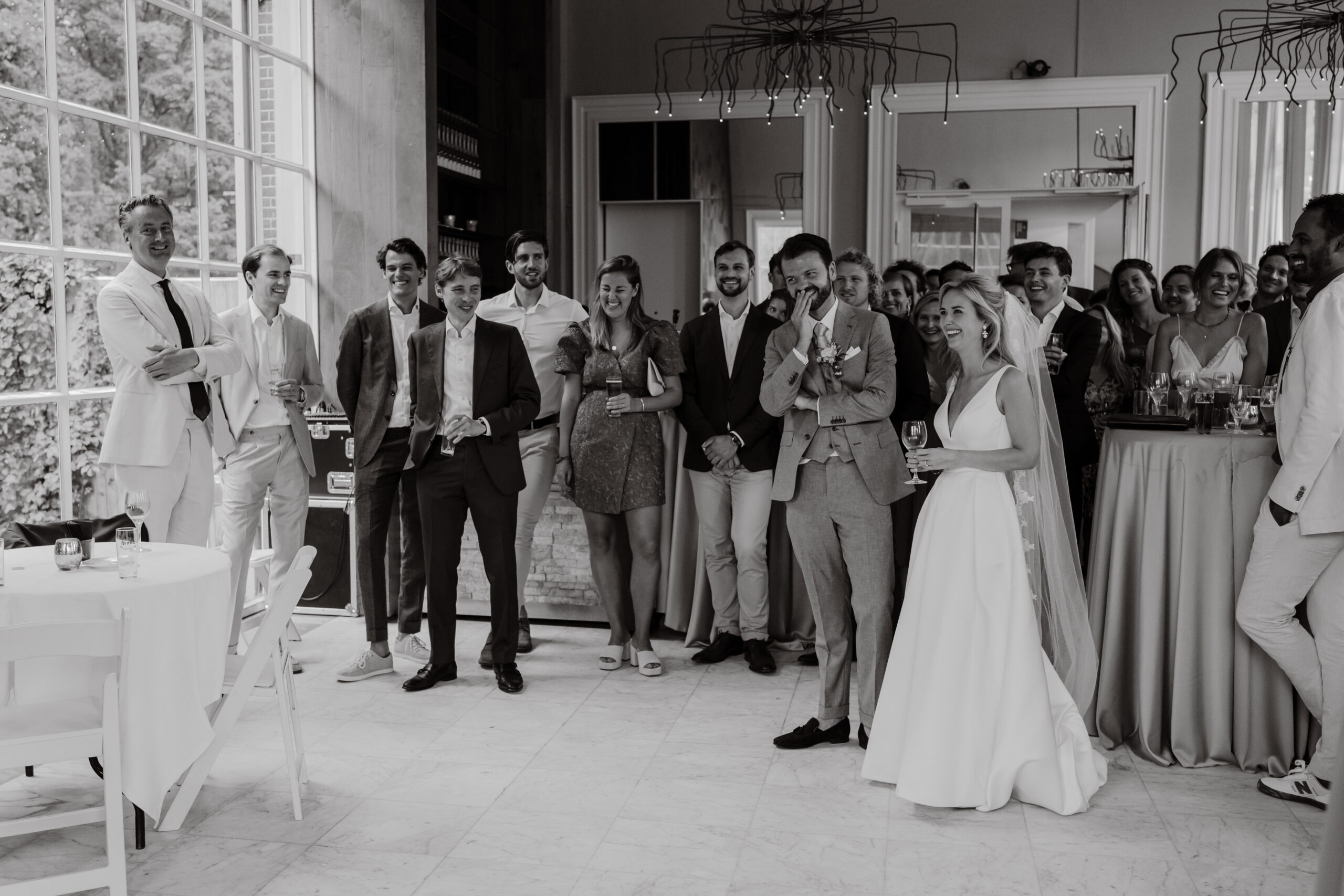 Na de ceremonie werd er geproost met oesters. Geen taart op dit moment, want die werd bewaard tot na het diner, als toetje. Eerst was er tijd om te borrelen en bij te praten, waarna iedereen aanschoof voor het diner aan lange, prachtig gedekte tafels. Ook binnen is Orangerie Elswout adembenemend mooi.