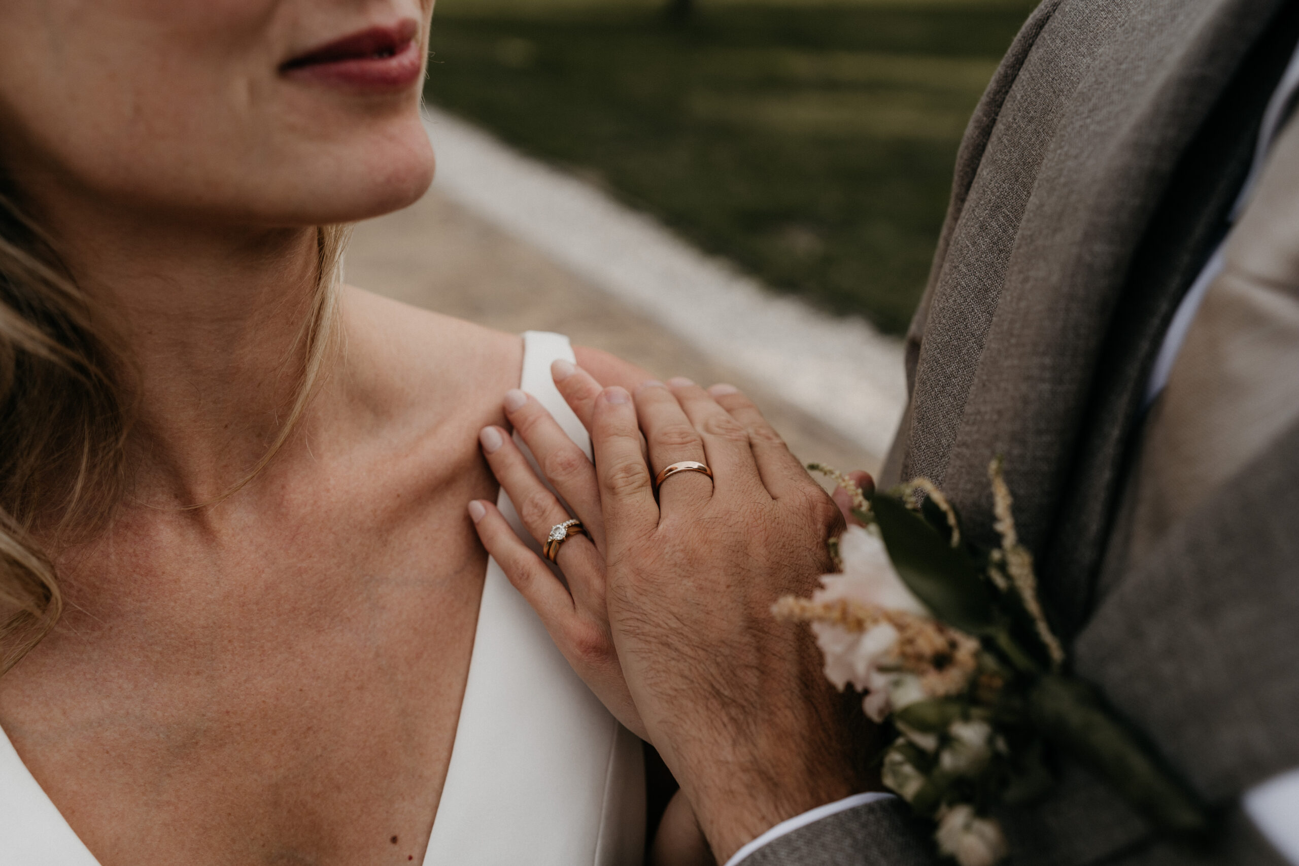 Later op de avond gingen we nog even naar buiten voor foto’s tijdens golden hour. Dat zachte licht, het bruidspaar samen, even een rustig moment voordat het feest losbarst, altijd een van mijn favoriete momenten van de dag.